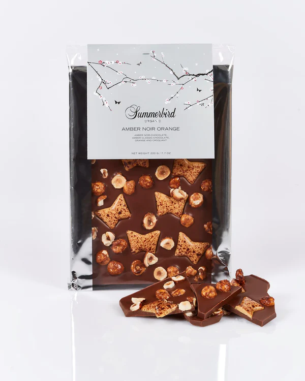 Denne chokoladebar består af Summerbirds prisvindende Amber-chokolade, drysset rundhåndet med krokant af Piemonte hasselnødder. Resultatet er en sprød, cremet og mangfoldig chokoladebar, der henleder tankerne på den klassiske og raffinerede franske dessert crème brûlée – den perfekte ledsager til en velbrygget kop kaffe.
